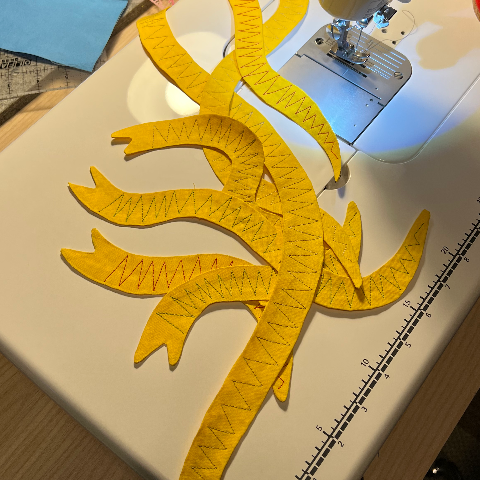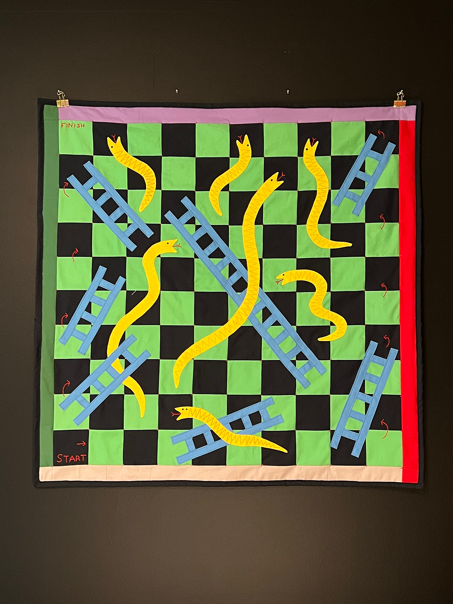 Method: I free-formed this pattern using all fabric and supplies I had already. The ladders are custom made bias tape and the snakes were made with pellon fusible interfacing and machine details.